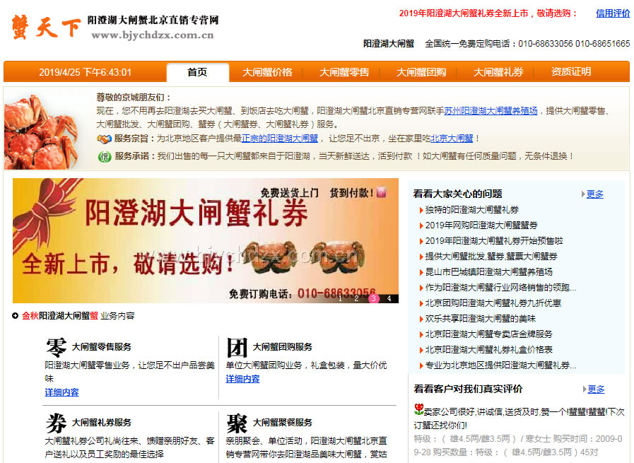 阳澄湖大闸蟹北京直销专营网提供大闸蟹批发、北京大闸蟹团购、大闸蟹礼劵、北京大闸蟹礼劵、蟹劵、蟹卡、蟹票。是阳澄湖大闸蟹协会的理事单位,阳澄湖大闸蟹地理标志保护产品专营单位,阳澄湖东湖特约经销单位,公司一贯秉承“质量为本,服务至上”的经营理念。阳澄湖清水大闸蟹享有"蟹中之王"的美称;阳澄湖出产的大闸蟹,历来是最负盛名的,肉质肥嫩鲜美,食过后再食其它再好的佳肴名菜,都会索然无味。阳澄湖蟹在海外久享盛誉,被称为“中华金丝绒毛蟹”每一只蟹都有“青背、白肚、黄毛、金爪”的好品相。且入口佳,蟹壳薄而脆,肉嫩、膏肥、脂腴,香郁甘甜…
