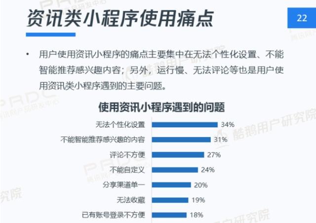 2、查找不便、运行卡、功能单一是小程序存在的主要问题。尤其是对小程序缺少认知的中老年用户,查找不方便会影响用户使用。明确路径、提升操作流畅性是提升用户粘性的关键因素;其次,目前功能相对单一,增加实用功能是当下需要努力的方向。