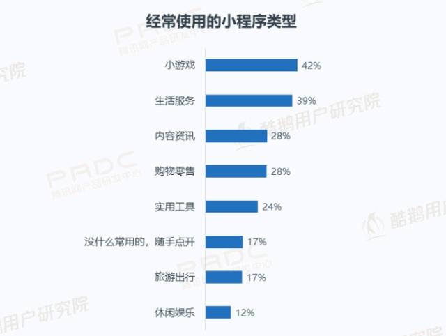 3、未来,实用、休闲类小程序更受用户欢迎。近7成用户看好小程序,超4成用户认为小程序可以替代不常用APP;年轻用户喜爱创意休闲,年长用户看重生活实用;未来线下、生活类场景仍是小程序的重要战场。调查显示,42%的用户经常使用微信小游戏,位居常用小程序类型首位。