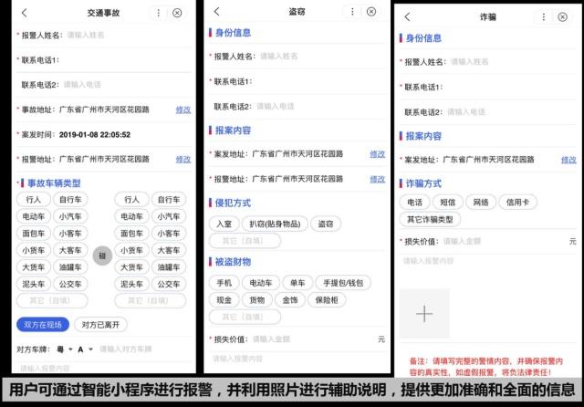 产品功能上,“广东110”智能小程序可满足用户多场景下的报警需求。针对紧急情况,平台优先推荐“电话报警”,并自动设置好报警界面,实现一键快速报警。针对非紧急的情况,支持用户自助报警,按照智能小程序的指引输入相关内容,对于像交通事故、盗窃、诈骗、人员走失等常见报警问题均可进行处理。无论哪种方式,都能帮助用户提升报警效率,帮助警员准确判断警情性质、危急程度,实现精准调度。